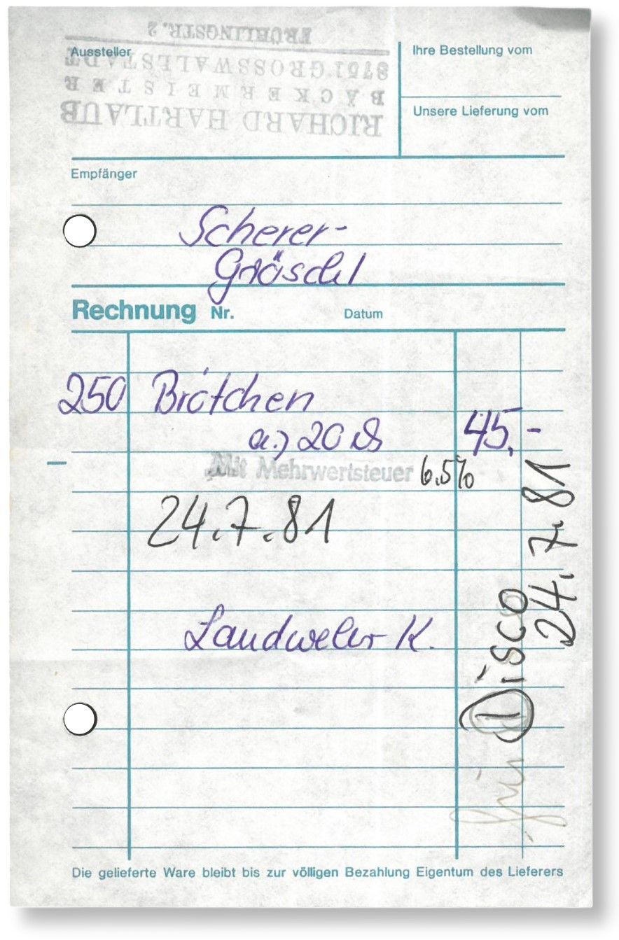Bei der obigen Gesamtübersicht wurden noch keine Werbeausgaben berücksichtigt. Der vorläufige Gewinn bei unserer allerersten Veranstaltung belief sich somit auf 685,93 DM (810,93 DM - 125,- DM). Zwar nicht die Welt, aber dafür, dass wir letztendlich ein großes Risiko eingangen sind, waren wir zufrieden. Von insgesamt 340 Besuchern wurde Eintritt kassiert (194 x 3,- DM / 146 x 2,- DM ab 22 Uhr), ab 23 Uhr war der Eintritt frei. Angesichts dieser Zahlen und der Getränkeabrechnung (280 Ltr. Faßbier, nur 140 Fl. 0,33l Cola/Limo) lässt sich vermuten, dass die jungen "Disco-Gänger" unsere Kosten nicht gedeckt hätten. Viele Gäste kamen später und sorgten wahrscheinlich für den Großteil des Bierumsatzes. Die Abrechnung hier stimmt mit der Getränkerechnung der Fa. Gottfried Höflich überein, siehe Beleg in nachfolgender Galerie. Selbst der Eigenbedarf wurde, wie es der Fiskus vorschreibt, versteuert. Bei den belegten Brötchen jedoch hatten wir uns ordentlich verkalkulliert, nicht mal die Hälfte ging weg. Fällt eindeutig in die Kategorie "Lehrgeld zahlen" :-)