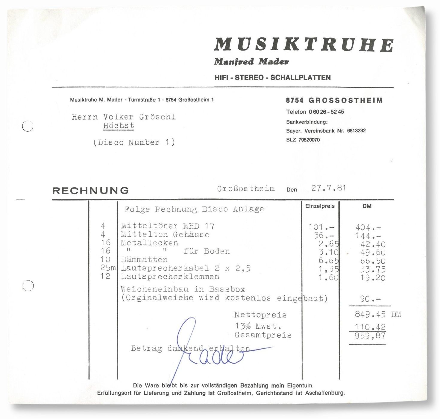 Nachfolgend einige weitere Belege zu dieser Veranstaltung und zum dafür damals notwendigen Kauf der für uns gebauten Lautsprecherboxen. Auch sechs 7"-Singles (wahrscheinlich die aktuellen Chartbreaker) wurden noch am Veranstaltungstag in der Plattenkiste Obernburg gekauft. Später, als unsere Ansprüche in Sachen Musik wesentlich höher waren, wurden fast ausschließlich 12" Maxi-Singles in erlesenen Plattenläden, z.T. direkt in Amsterdam, gekauft. Infos und weitere Belege zum Thema Sound- und Lichtanlage sind hier... hinterlegt. Zur besseren Zuordnung für den Steuerberater wurde viele Belege damals handschriftlich gekennzeichnet.