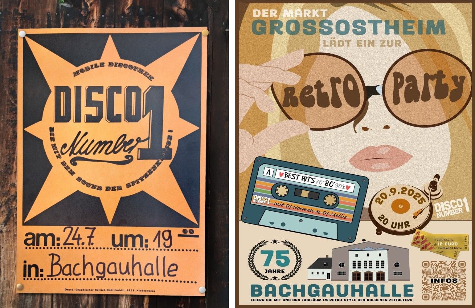 44 Jahre liegen zwischen diesen beiden Plakaten. Unsere erste und letzte offizielle veranstaltung. Links noch per Hand (auch der Plakatentwurf wurde mit Filzschreiber, Lineal und kleinen Rubbelbuchstaben entworfen) und rechts das (zumindest derzeit) moderne Poster zur Retro-Party 2025.
