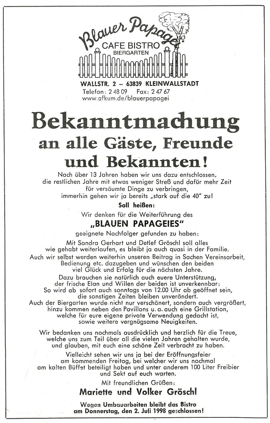 Im Sommer 1998- gaben wir Sandra & Detlef dem Wunsch zur Übernahme nach und veräußerten den Laden, die beiden waren von nun an die neuen Wirtsleute. Siehe auch Bekanntmachung oben. Nach insgesamt 13 ereignisreichen Jahren (1985-98) schlugen wir einen anderen, etwas ruhigeren Lebensweg ein. Mariette bediente anfangs noch einige Wochen, zum "Einarbeiten" hinter der Theke, bald darauf konnte auf ihre Hilfe verzichtet werden. Den Tischfußballverein "TFF Kleinwallstadt", den Volker im Dezember 1986 ins Leben ruf und mit welchem man im Jahre 1996 die Deutsche Mannschaftsmeisterschaft feiern konnte, wurde weiterhin von Volker supportet.
