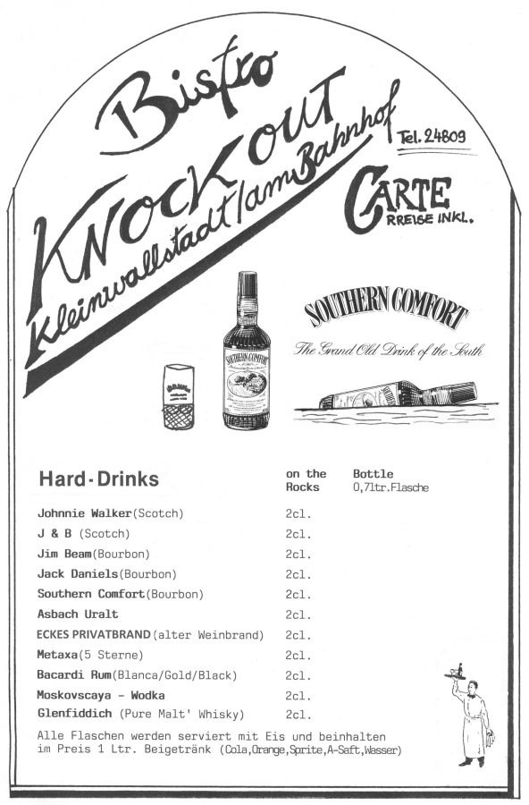 Getränkekarten 1986/1987, KNOCK OUT - Discothek inkl. Bistrobetrieb nachmittags