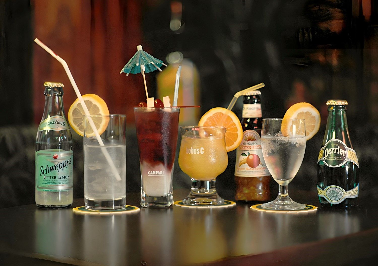 Bei der Auswahl unserer Getränke legten wir viel Wert auf erlesene Marken. Serviert möglichst in der kleinen 0,2-Literflasche und in damals originellen Markengläsern, liebevoll garniert. Hier im Bild Schweppes Bitter Lemon, BaKi (Banane-Kirsch, garniert mit Bananenscheiben und Cocktailkirschen), Dr. Kochs Fruchtsäfte von Eckes und Perrier Wasser. Kurze Zeit später noch die leckere "Orangina" (natürliche Limonade mit feinem Fruchtfleisch) hinzu.
