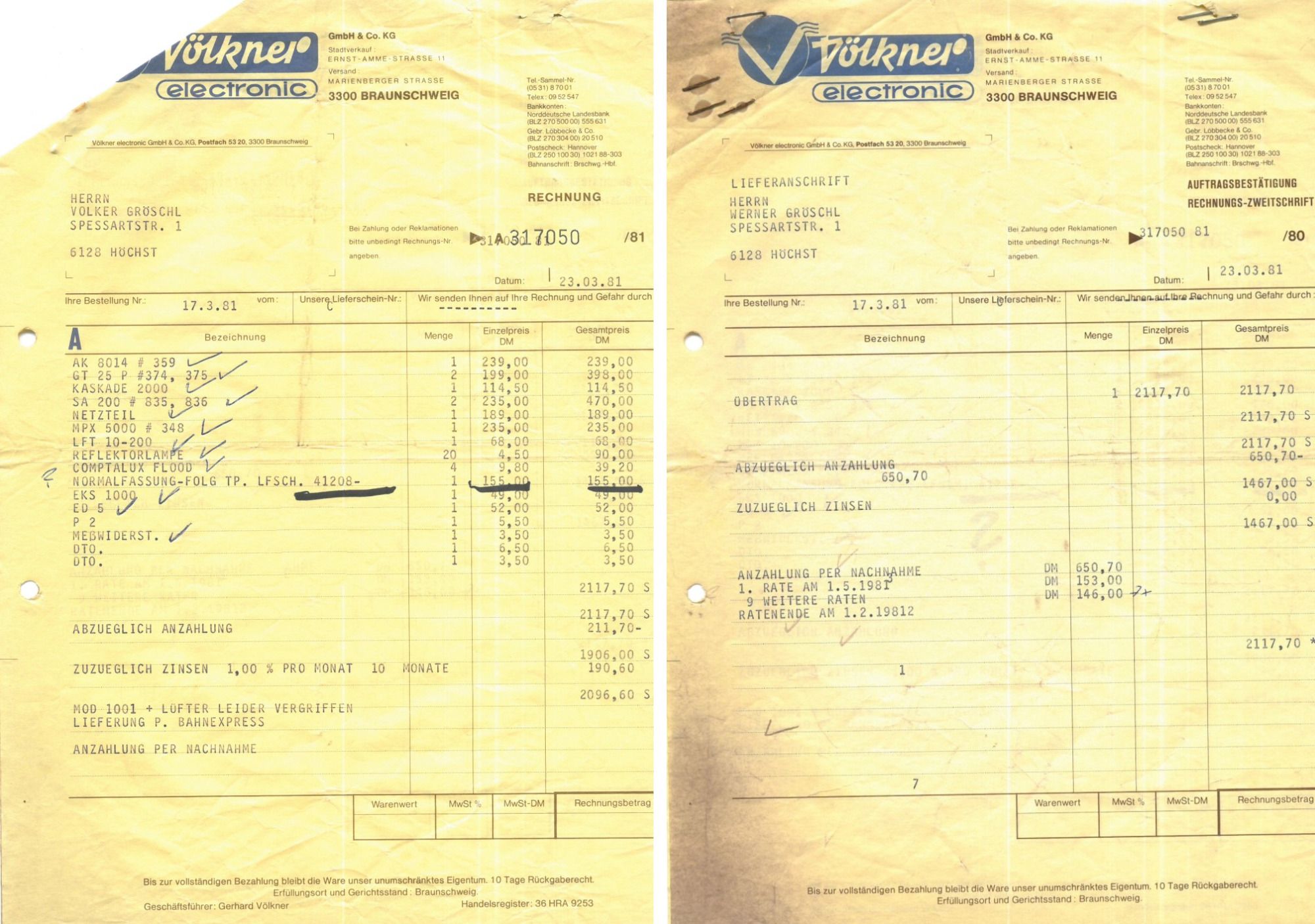 Angefangen hatte es mit einigen Bausätzen von "VÖLKNER electronic", siehe die erste Bestellung vom 23.3.1981 über 2117,- DM. Wir bastelten uns quasi eine Disco. Vorverstärker, Endstufe, Strahler u.v.m. wurden per Ratenkauf mit 650,- DM (umgerechnet auf heute ca. 870 Euro) Anzahlung geordert, der Bau von vier professionellen Audax-Lautsprecherboxen bei der Musiktruhe Manfred Mader in Großostheim in Auftrag gegeben und ein übergroßes DJ-Pult eigens zusammengeschweißt. Auf die z.T. tragische Geschichte vom Eigenbau dieses Pult-Monstrums wird in unserem Bildband eingegangen.